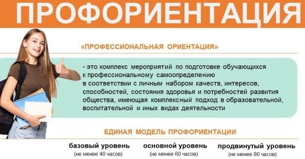 Министерство просвещения Российской Федерации реализует профориентационные проекты, в том числе в рамках федерального проекта «Успех каждого ребенка» нацпроекта «Образование». Минпросвещения России разработало единую модель профориентационной деятельности, в ее основу заложен профориентационный минимум для школьников 6–11-х классов, включая детей с ОВЗ и инвалидностью. Профминимум включает три уровня на выбор образовательной организации: базовый (не менее 40 часов в учебный год), основной (не менее 60 часов в учебный год), продвинутый (не менее 80 часов в учебный год). Каждый уровень профминимума реализуется по семи ключевым направлениям: профильные предпрофессиональные классы (инженерные, медицинские, космические, IT, педагогические, предпринимательские), ориентированные на востребованные профессии на рынке труда; урочная деятельность, которая включает 100 тыс. часов дополнительных материалов к учебным предметам (физика, химия, математика, технология), разработанных Фондом гуманитарных проектов, с целью профессионального окрашивания уроков; внеурочная деятельность, предусматривающая один час в неделю на проведение профориентационных мероприятий (онлайн-диагностика, уроки, проектная деятельность, профориентационные программы, классные часы, в том числе просмотр выпусков открытых онлайн-уроков «Шоу профессий», беседы, дискуссии, мастер-классы, коммуникативные и деловые игры, консультации педагога и психолога, моделирующие профессиональные пробы в онлайн-формате и др.); воспитательная работа (экскурсии на производство, лекции, профориентационные выставки, ярмарки, профессиональные пробы, дни открытых дверей в колледжах и вузах, открытые уроки технологии на базе колледжей, встречи с представителями разных профессий, конкурсы профориентационной направленности, чемпионаты по профессиональному мастерству «Абилимпикс», «Профессионалы» и Чемпионат высоких технологий); дополнительное образование (посещение занятий с учетом склонностей и образовательных потребностей); профобучение (обучение по программам подготовки по профессиям рабочих и служащих по образцу существовавших учебно-производственных комбинатов); взаимодействие с родителями или законными представителями (проведение не менее двух собраний с представителями разных профессий). Один из ключевых профориентационных проектов – федеральный проект «Билет в будущее», охват которого составляет уже более 2,2 млн школьников.